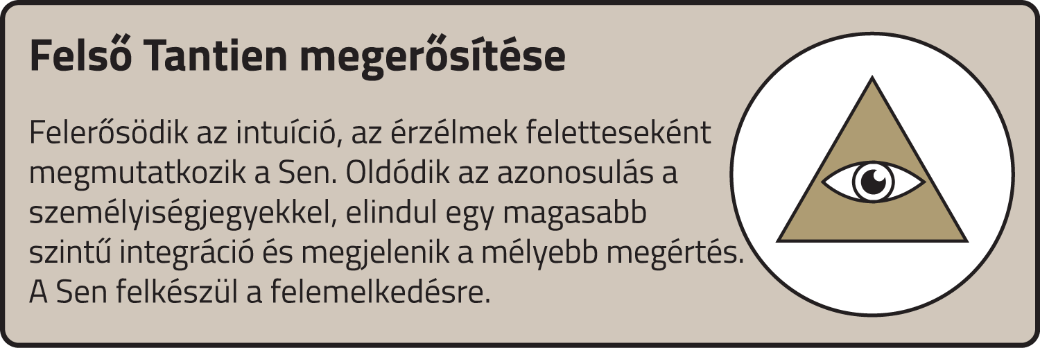 A Felső Tantien megerősítésével elindulsz a csend állapota felé. A gondolati kavargások ésjövő-menő képek csendjében az intuitív szellemi képességeid és mentális erőid indulnak növekedésnek. Mindez oly módon történik, hogy nem veszel el a képzelgések és illúziók tengerében. Megmarad a talaj a lábad alatt. Felébredő extra érzékeléseddel egyre többet érzékelsz a téged körülvevő valóságból.